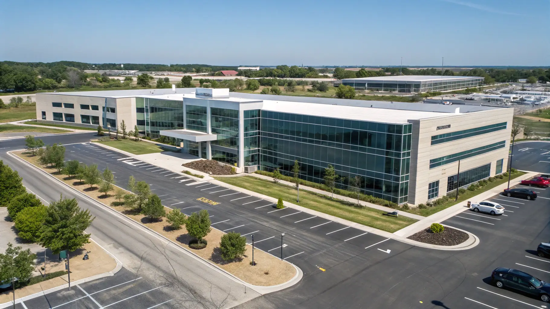 - Modern office with green rooftops